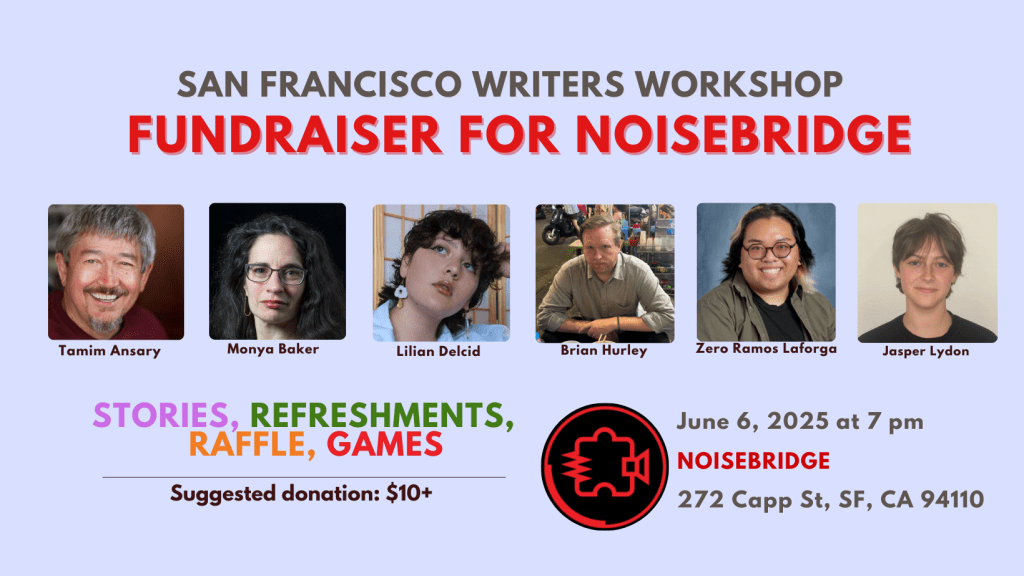 This summer marks ten years since I, Judy Viertel, and Kurt Wallace took over from Tamim in moderating the San Francisco Writers Workshop, with Monya Baker joining us later. These days, the workshop is meeting at a hackerspace in the Mission, Noisebridge, and this coming Friday, June 6 at 7 pm, we’ll be gathering there to celebrate the workshop and to fundraise for our venue. Noisebridge allows us space to meet for free, while their own rent is sky high. In addition to hosting our group, Noisebridge also provides a stage for Lit Crawl and other literary gatherings throughout the year. I’ve been encouraging everyone I know to donate what they can to help support this organization that contributes to the vitality of San Francisco’s literary scene.